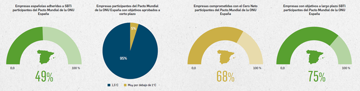 Según los datos del Anuario Climático 2025, casi la mitad (49%) de las empresas españolas adheridas a la iniciativa internacional Science Based Targets (SBTi) son participantes del Pacto Mundial de la ONU España. Además, el 95% de estas compañías ha establecido objetivos a corto plazo alineados con el escenario de 1,5 ºC, demostrando un compromiso firme y medible con la descarbonización.