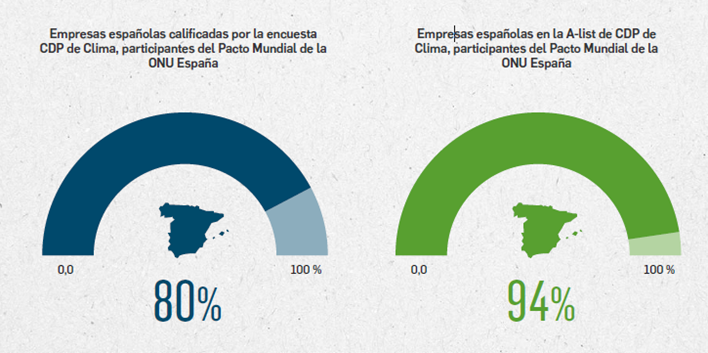 Dentro de esta encuesta, las empresas reciben una puntuación que refleja su nivel de madurez en materia climática. Aquellas que demuestran un liderazgo claro en gobernanza, estrategia, gestión de riesgos y reducción de emisiones obtienen las máximas calificaciones del nivel de Liderazgo (A o A-) o también denominadas A-list. En 2024, el 94% de las empresas españolas en el sello de excelencia A-list del CDP de Clima eran participantes del Pacto Mundial de la ONU.